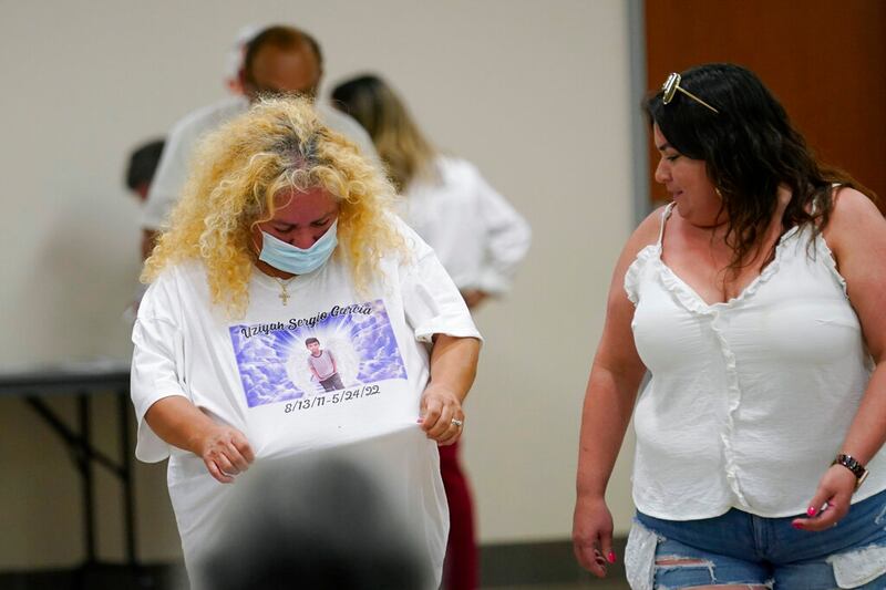 School shooting report rocks Uvalde community Grace Valencia, great aunt of shooting victim Uziyah Garcia, left, arrives for a presentation of the Texas House investigative committee report on the shootings at Robb Elementary School, Sunday, July 17, 2022, in Uvalde, Texas. (AP Photo/Eric Gay) (Eric Gay/AP)