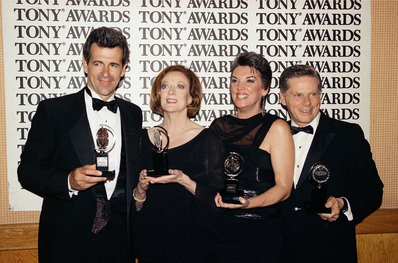 Photos: Robert Morse through the years FILE - Tony Award winners, from left to right, James Naughton, best actor in "City of Angels," Maggie Smith, best actress for "Lettice and Lovage," Tyne Daly, best actress for "Gypsy," and Robert Morse, best actor for "Iru" pose with their trophies in New York on June 3, 1990. Morse, who won a Tony Award as a hilariously brash corporate climber in “How to Succeed in Business Without Really Trying” and a second one a generation later as the brilliant, troubled Truman Capote in “Tru,” died peacefully at his home on Wednesday, April 20, at the age of 90. (AP Photo/Richard Drew, File) (Richard Drew/AP)