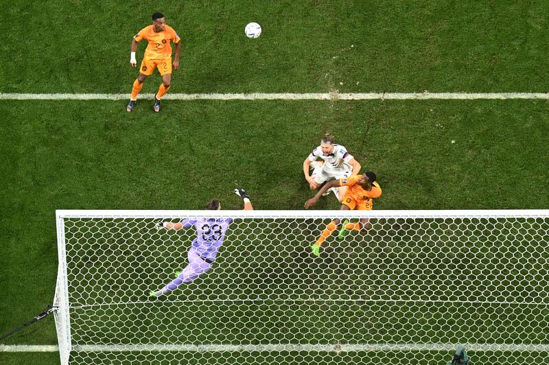 World Cup Netherlands vs USA DOHA, QATAR - DECEMBER 03: Denzel Dumfries of Netherlands scores the team's third goal past Matt Turner of United States during the FIFA World Cup Qatar 2022 Round of 16 match between Netherlands and USA at Khalifa International Stadium on December 03, 2022 in Doha, Qatar. (Photo by Matthias Hangst/Getty Images) (Matthias Hangst/Getty Images)