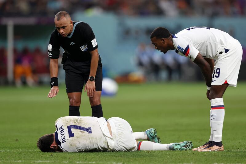 World Cup Netherlands vs USA DOHA, QATAR - DECEMBER 03: Giovanni Reyna of United States lies on the pitch during the FIFA World Cup Qatar 2022 Round of 16 match between Netherlands and USA at Khalifa International Stadium on December 03, 2022 in Doha, Qatar. (Photo by Clive Brunskill/Getty Images) (Clive Brunskill/Getty Images)