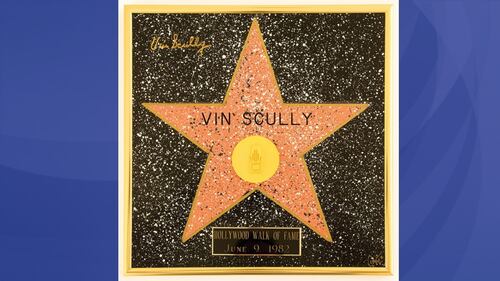 Vin Scully collection Vin Scully got his own star on the Hollywood Walk of Fame in 1982. This replica is signed in gold by the broadcaster. (Hunt Auctions)