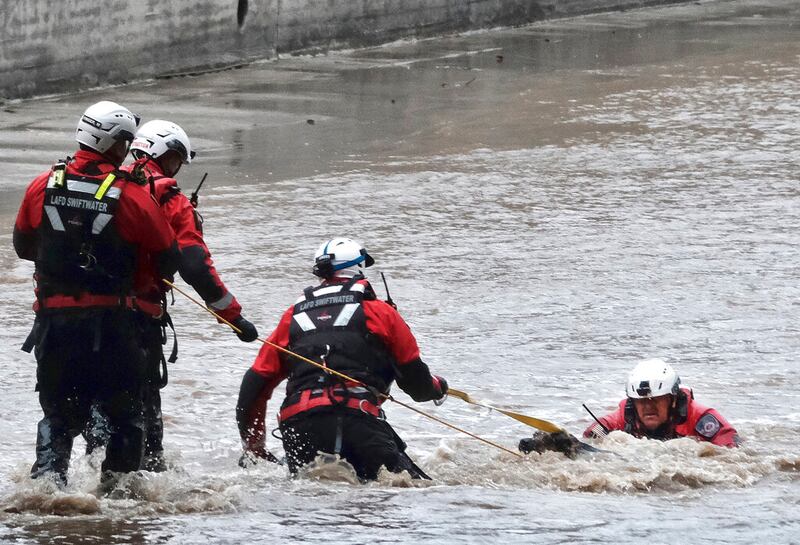 California storms A Los Angeles Fire Department Swift Rescue team walk off after pulling a dog from the LA river in the Studio City section of Los Angeles on Monday, March 28, 2022. Two people and a dog were rescued from a rain-swollen Southern California river Monday as a vigorous late-season storm moved slowly through the state, bringing heavy showers and snow. A helicopter rescue crew pulled the dog's owner, a woman, from the rushing Los Angeles River, in the San Fernando Valley, around 2:40 p.m. But the dog slipped away and continued for more than an hour down the river, which runs through an inaccessible channel with high concrete walls for several miles. (AP Photo/Richard Vogel) (Richard Vogel/AP)