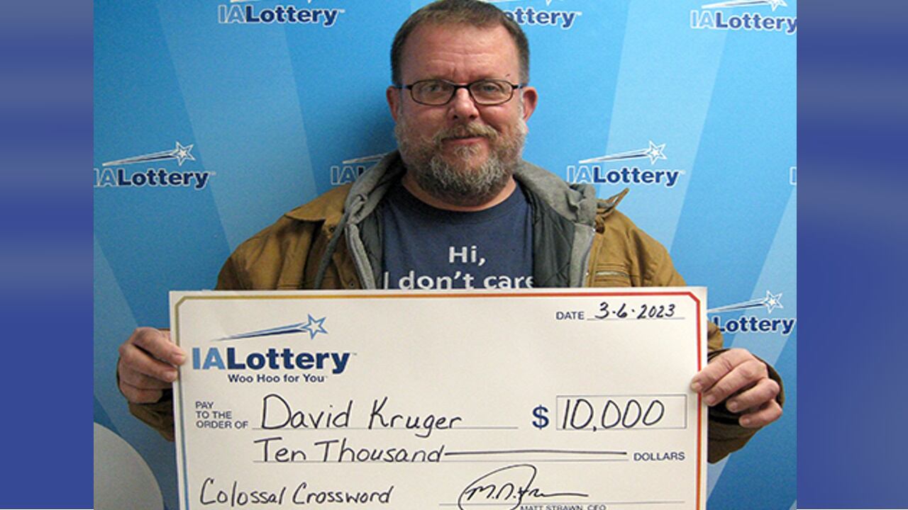 David Kruger, 47, of Charles City, won the Iowa Lottery’s “Colossal Crossword” scratch-off game and collected his prize on Monday in Mason City, the Iowa Lottery said in a news release