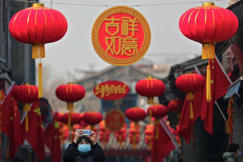 Lunar New Year celebrated around the world A woman wearing a face mask to help curb the spread of the coronavirus takes a photo under red lanterns decorated along an alley in celebration of the Lunar New Year in Beijing, Thursday, Feb. 11, 2021. China appeared to be on pace for a slower than normal Lunar New Year travel rush this year after authorities discouraged people from traveling over the holiday to help maintain the nation's control over the ongoing COVID-19 pandemic. (AP Photo/Andy Wong)