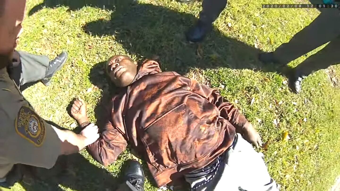 About a minute later, the officers remove the handcuffs and call for an ambulance. Smith questions why he is being arrested.