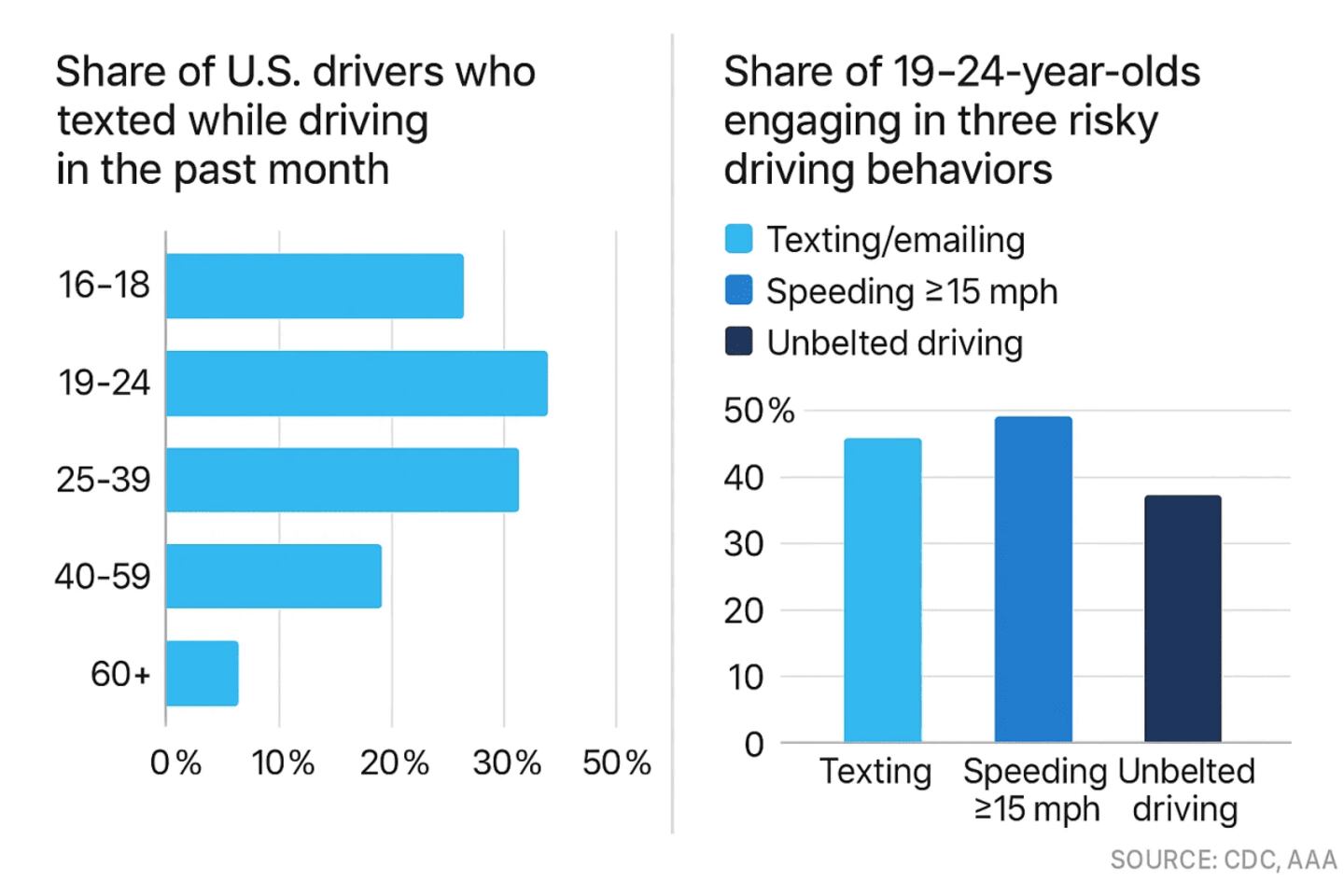 - 45.5% of drivers aged 19 to 24 manually sent a text or email via handheld device in the last month.