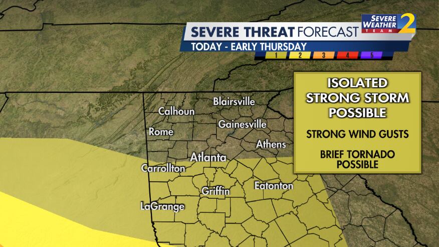 Here in north Georgia, there is a Level 1 out of 5 risk for strong to severe storms. The tornado threat is low, but not zero.